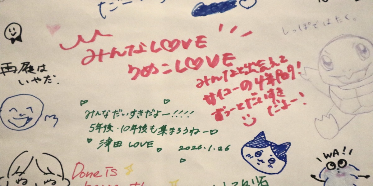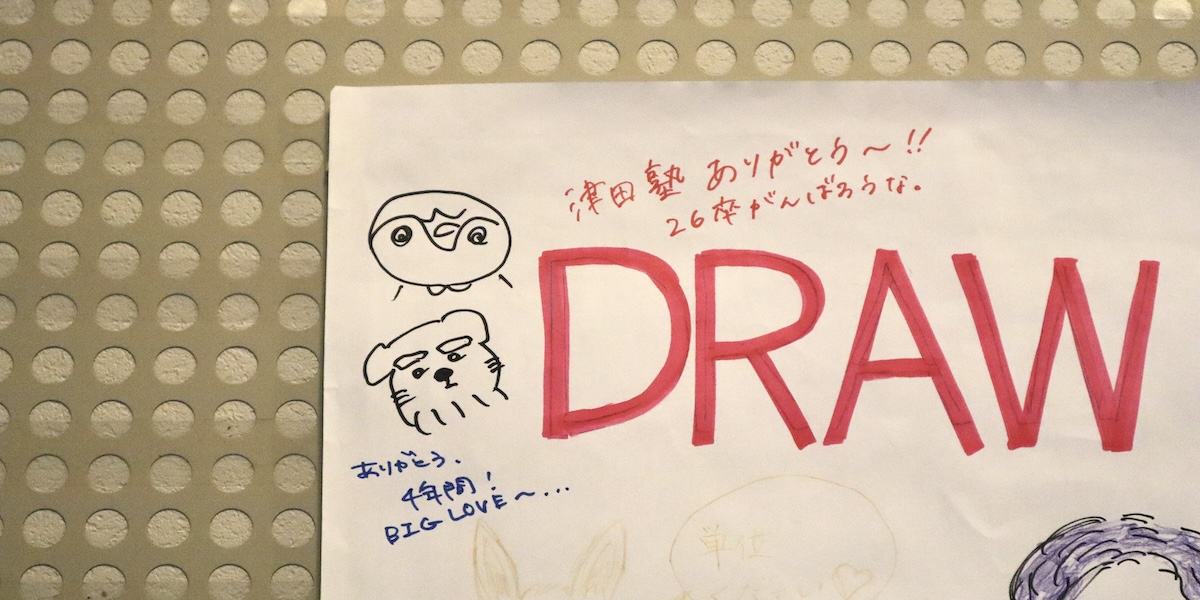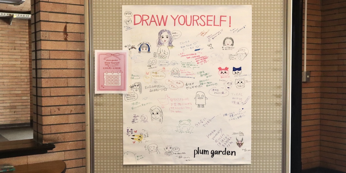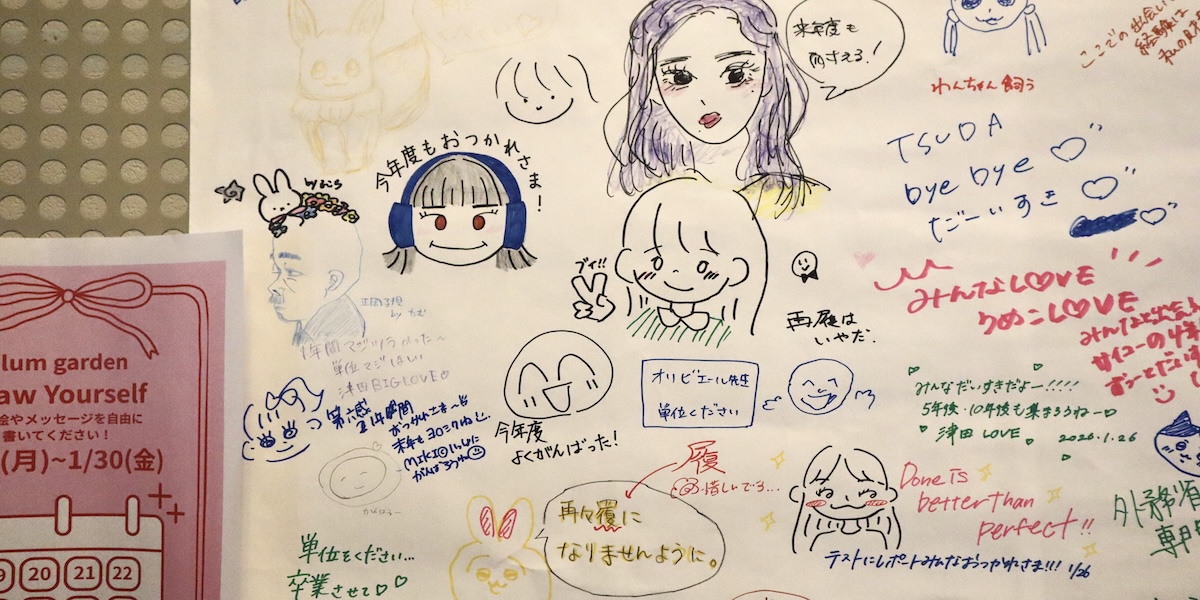 本企画の実施期間は2週間と短く、また年度終わりの時期でした。これまで馴染みのあった人や場所との別れを惜しみつつ、春からの新たな生活や人との出会いに期待を膨らませるこの季節だからこそ、思うままに自己表現することが、これまでを振り返る機会になったのではないでしょうか。描かれたイラストやメッセージを見た誰かは、それらを受け取ることで笑顔になり、津田塾大学での生活を懐かしみ、元気づけられたと思います。