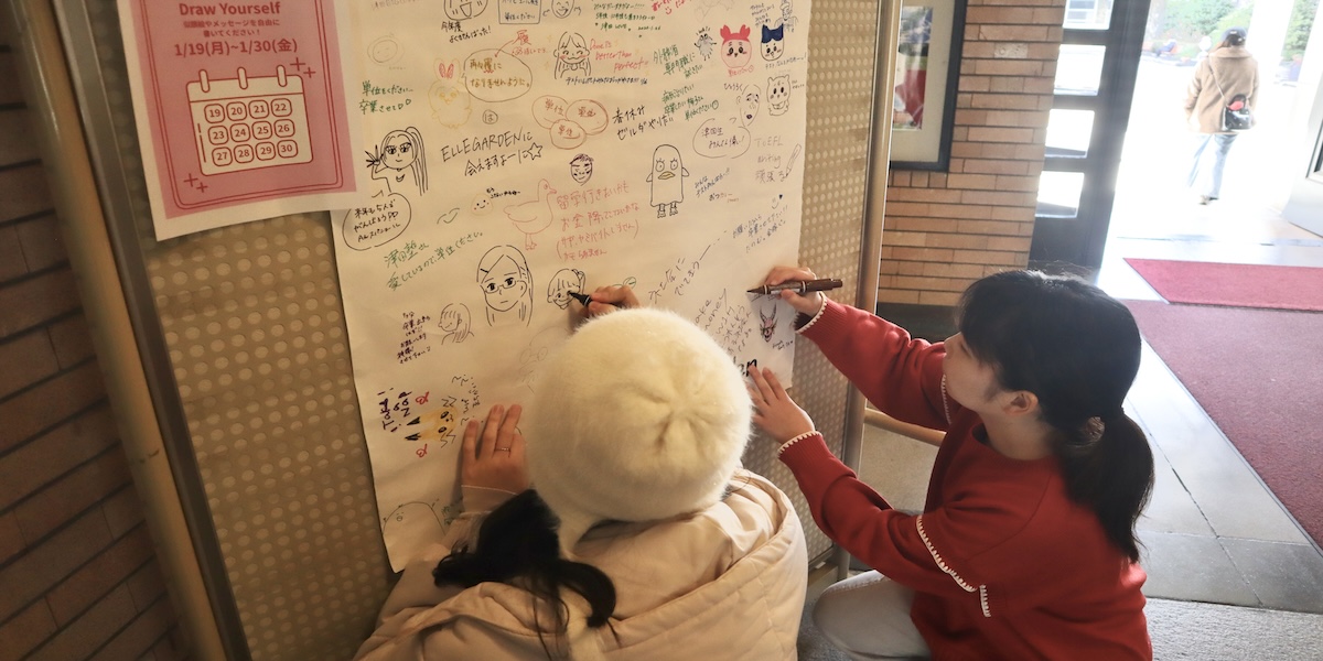 小平キャンパス本館1階に大きな紙を1枚掲示し、2026年1月19日(月)から1月30日(金)の10日間、学生をはじめ教職員や来校者の方々に、自由にイラストとメッセージを描いてもらいました。